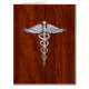 The Symbolic Silver Chrome Like Caduceus Medical Symbol design presented here on a rich mahogany wood grain printed decor. The caduceus snakes is designed to look like it is made of chrome. Good for a graduation occasion, a statement for your profession, or for a gift with that medical look your are looking for.