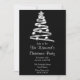 A silver christmas tree on a black background. The back of the invite is black with snow pattern