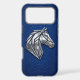 Gallop into luxury with this stunning iPhone 17 Pro Max case. Featuring a sleek, metallic silver geometric horse head in a sharp 3D chrome style, symbolizing speed, freedom, and strength. The modern industrial art is set against a premium cobalt blue python snakeskin background for a sophisticated and high-end aesthetic. Perfect for equestrian lovers and those who appreciate futuristic minimalist wildlife art. A bold and elegant protective shield for your tech.
