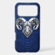 Experience the power of precision. This luxury iPhone 17 Pro Max case features a magnificent metallic silver geometric ram head with detailed spiraling horns in a 3D chrome style. The modern industrial aesthetic is perfectly set against a premium cobalt blue python snakeskin texture. A bold statement piece for those who value leadership, determination, and high-end minimalist art. Designed to provide a sophisticated and protective armor for your tech.