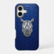 Protect your phone with the symbol of unstoppable power. This luxury iPhone 16 case features a metallic silver geometric rhino head in a sharp 3D chrome style. The industrial design is set against a premium cobalt blue python snakeskin texture, perfect for those who value strength and modern minimalist art.