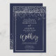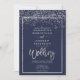 Silver confetti navy blue winter script wedding invitation