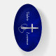 This beautiful paperweight shows a shiny silver Christian cross with interlocked silver hearts at the foot. The images are set against a gradient royal blue background that almost seems to glow. A name text field is located on each side of the cross. A simple, but elegant and powerful statement.