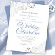 These affordable, budget friendly wedding invitations are the perfect choice for class, style, and beauty on a budget. The design features dusty blue and gray text on a classic white background with ornate silver gray curls and swirls in the corners. The typography includes fancy script lettering for a style that is at once simple and elegant. Wonderful way to invite your friends and family to share in your joy on your special day without breaking the bank.