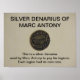 Silver Antony of Marc Antony coin photo with words saying This is a silver denarius used by Marc Antony to pay his legions. Each legion had its own coin. Makes a nicxe print.