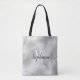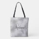 Add a touch of elegance to her shopping with this chic tote bag, featuring a trendy pattern of sparkling diamond glitter confetti on a faux silver foil background. Personalize it with her initial in white serif font and her name in charcoal gray handwriting-style brush script.