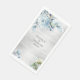 A modern and elegant watercolor painted wedding napkin featuring a bouquet of dusty blue peony blossoms against a silver watercolor wash background with a lively slender serif font.