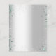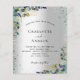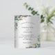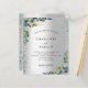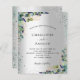 Faux silver looking background decorated with eucalyptus greenery, golden foliage and silver and green faux glitter, sparkles. Personalize and add your names and wedding details. Black letters.