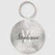 This chic keychain features a pattern of faux glitter diamond confetti on a silver faux foil background. Personalize it with your initial in white serif font and your name in charcoal gray handwriting-style brush script.