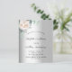 A faux silver looking background. Decorated with a white floral, peony flower and green watercolored eucalyptus greenery. Personalize and add your names and the details.