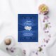 This romantic wedding invitation has real silver foil floral arches above and below a PRINTED ON royal blue ribbon and simulated silver glitter and crystal joined heart brooch across the center of a blue background. The names of the happy couple appear in white above the ribbon, with the customizable verse below the ribbon that says, "Two lives, two hearts, Joined together by friendship, United forever in love". The back side of the invitation is gray with a royal blue decorative scroll and floral frame around the wording that is in blue with the same pair of double hearts at the top back between the floral arches. There are also RSVP details on the back of the invitation, making this an affordable, yet luxurious wedding invitation that is sure to enchant your wedding guests.