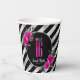 Celebrate in style with this unique Sweet Sixteen paper cup design featuring a large, faux foil 'Sweet 16' in silver and hot pink. The solid black background is topped with diagonal stripes in the same silver foil effect with lush hot pink roses around an oval frame. If preferred, the eye-catching 'Sweet 16' is optional and can be deleted to use this template for other occasions. Use the provided template to customize your name and birthdate. Search ID759 to see other products and color options for this design.