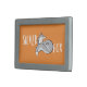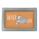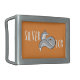 A bold belt buckle with gray fox illustration and the text, Silver fox