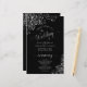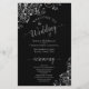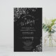 These wedding programs are elegant and tasteful, while still being budget friendly. The design features ornate silver gray faux foil curls and swirls with pale gray text on a black background. The typography features lacy script calligraphy, and there is room for details on the ceremony, the bridal party, and a short thank you.