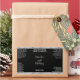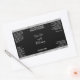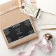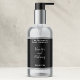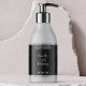 This elegant product label for cosmetic bottles features a black background with a faux silver glitter foil border. This label contains space for your product name, business name, product weight, ingredients, instructions, social media, and business address.