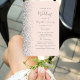 This elegant, modern wedding program fan features a blush pink background edged with silver faux glitter. The text appears in elegant gray handwriting and copperplate fonts.