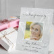 A faux silver metallic looking background, a white frame, faux glitter dust, a faux silver butterfly behind the photo. Personalize and add a name, dates and your text. Black text.