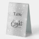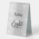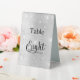 The table number is written with an elegant hand lettered style script. Black letters, a faux silver background with gaux glitter dust, sparkles.