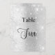 The table number is written with an elegant hand lettered style script. Black letters, a faux silver background with faux glitter dust, sparkles.