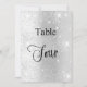 The table number is written with an elegant hand lettered style script. Black letters, a faux silver background with faux glitter dust, sparkles.