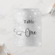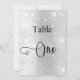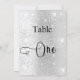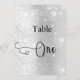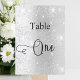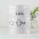 The table number is written with an elegant hand lettered style script. Black letters, a faux silver background with faux glitter dust, sparkles.