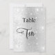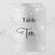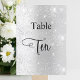 The table number is written with an elegant hand lettered style script. Black letters, a faux silver background with faux glitter dust, sparkles.