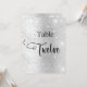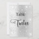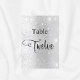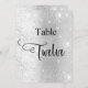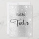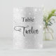 The table number is written with an elegant hand lettered style script. Black letters, a faux silver background with faux glitter dust, sparkles.
