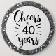 A silver glitter cheers to 40 years button which is great for a 40th birthday, 40th anniversary, etc. Please note there is not actual glitter on this product but a design effect.