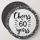A silver glitter cheers to 60 years button which is great for a 60th birthday, 60th anniversary, etc. Please note there is not actual glitter on this product but a design effect.