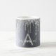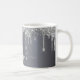 A girly and trendy monogrammed mug. A chic faux silver looking background decorated with faux glitter drips, paint dripping look. Personalize and add a name and monogram letter. White and gray colored letters. The name is written with a modern hand lettered style script with swashes. To keep the swashes only delete the sample name, leave the spaces or emoji's in front and after the name.