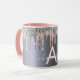 A girly and trendy monogrammed mug. A chic faux silver looking background decorated with pink and faux silver glitter drips, paint dripping look. Personalize and add a name and monogram letter. White and pink colored letters. The name is written with a modern hand lettered style script with swashes. To keep the swashes only delete the sample name, leave the spaces or emoji's in front and after the name.