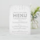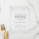 This lovely menu card design by The Spotted Olive™ features a pretty soft silver gray background with an image of gems streaming from the top and the word "Menu" stylishly filled with an image of silver glitter. PLEASE NOTE: THIS DESIGN ONLY FEATURES A PRINTED IMAGE OF GLITTER; THERE IS NO PHYSICAL GLITTER USED OR INCLUDED; THERE ARE NO EMBELLISHMENTS.