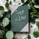 A stylish save the date postcard featuring faux silver glitter accents and a moody eucalyptus green background. The bold script "Save the Date" glistens with a brushed metallic effect, balanced by classic serif typography for names, date, and location. Diagonal glitter bands frame the corners for a modern yet festive finish. This flat card format is perfect for couples planning winter weddings, New Year's celebrations, or sophisticated urban events. The layout is fully editable to match your details and timeline.