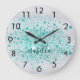 Silver glitter teal green name script large clock