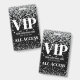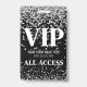 Silver Glitter VIP Event Badge. This stylish event badge is perfect for Sweet 16 parties, Bat Mitzvahs, New Year’s Eve celebrations, and more. The design features a black background with a shimmering silver glitter gradient at the top and bottom, adding a festive and elegant touch. The same design is printed on both sides for a polished look. Featuring bold serif fonts mixed with clean typography, it provides space for the event name, date, and "All Access Pass." The text is fully customizable, and you can even change the background color to match your event’s theme. This badge is a sophisticated way to make your guests feel extra special!