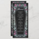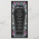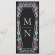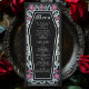 Add a touch of gothic elegance to your feast with these wedding menus featuring a coffin-shaped frame, adorned with thorns, roses, and silver accents against a black background. Perfect for a hauntingly romantic dining experience! Personalize the text, font, and background color to suit your design preferences. Matching Items in our shop for a complete party theme. Please note that the silver on the cards is NOT real foil and is printed in flat colors.