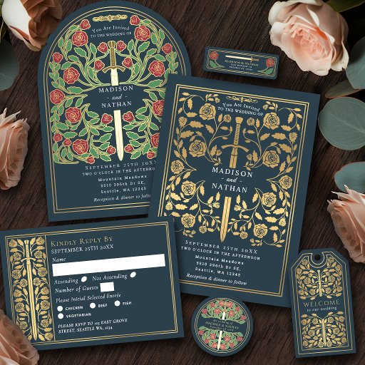 Celebrate your special day with these royal medieval sword wedding RSVP cards against a gray background. You can customize this further by clicking on the "PERSONALIZE" button. PLEASE NOTE: The silver on this item is NOT real foil and is printed in flat colors