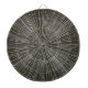 A painting of silver gray spokes in circular patterns, on black, cover this dart board. Follow the spokes and aim for the center.