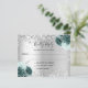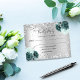 A faux silver metallic looking background, decorated with sparkling faux glitter and green florals. Personalize and add the reply by date and your names.