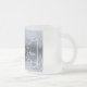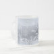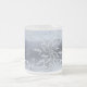 Beautiful, silvery, crystal ice snowflakes with a pretty scroll work frame on a frosted mug.