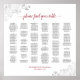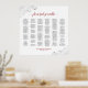 This beautiful wedding seating chart features red and gray text on a white background with seating assignments for 200-240 guests. It features a simple yet stylish and elegant design with ornate decorative faux foil silver filigree in the corners. The title is written in fancy script calligraphy and reads: Please find your table.
