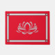 This doormat features an art deco style border and a beautiful lotus flower... in silver on a cherry red background.