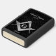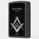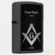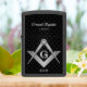 Silver monogrammed, square and compass symbol on a black patterned background on a zippo lighter.
