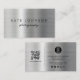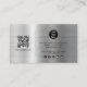 A beautiful design incorporating your business logo and your QR Code. This simple silver metal look modern script business card is ideal for all types of businesses. A simple and professional way to introduce your business. Social media icons included in the design of this business card for you to use. Personalize your details to create your own unique business card.