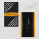 Silver metallic studs and diagonal stripes black orange business cards, featuring two triangles covered with metallic studs on two corners of the card, diagonal silver stripes and an orange band in the centre with your name. Black background.