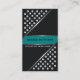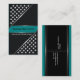 Silver metallic studs and diagonal stripes black teal business cards, featuring two triangles covered with metallic studs on two corners of the card, diagonal silver stripes and a teal band in the centre with your name. Black background.