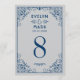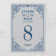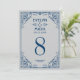 Intricate navy Art Deco scrollwork on a clean white background brings vintage elegance to this wedding table number card. The couple's names and wedding date are framed by ornate borders for a crisp, sophisticated monogram design. The couple's names, date, and table number are easy to personalize. Each table number must be individually personalized and added to the cart one at a time.