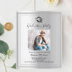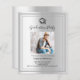 A faux silver looking background, decorated with a frame, and a graduation cap. Personalize and add a photo name and details. black text.