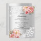 An elegant and romantic 25th wedding anniversary invitation. A faux silver looking background decorated with pink and rose gold florals, roses and white lace. Personalize and add your names and details.