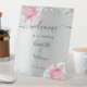 A wedding welcome sign. A faux silver looking background. Decorated with faux silver sparkles and pink and white flowers, roses. Personalize and add your names and the wedding date.